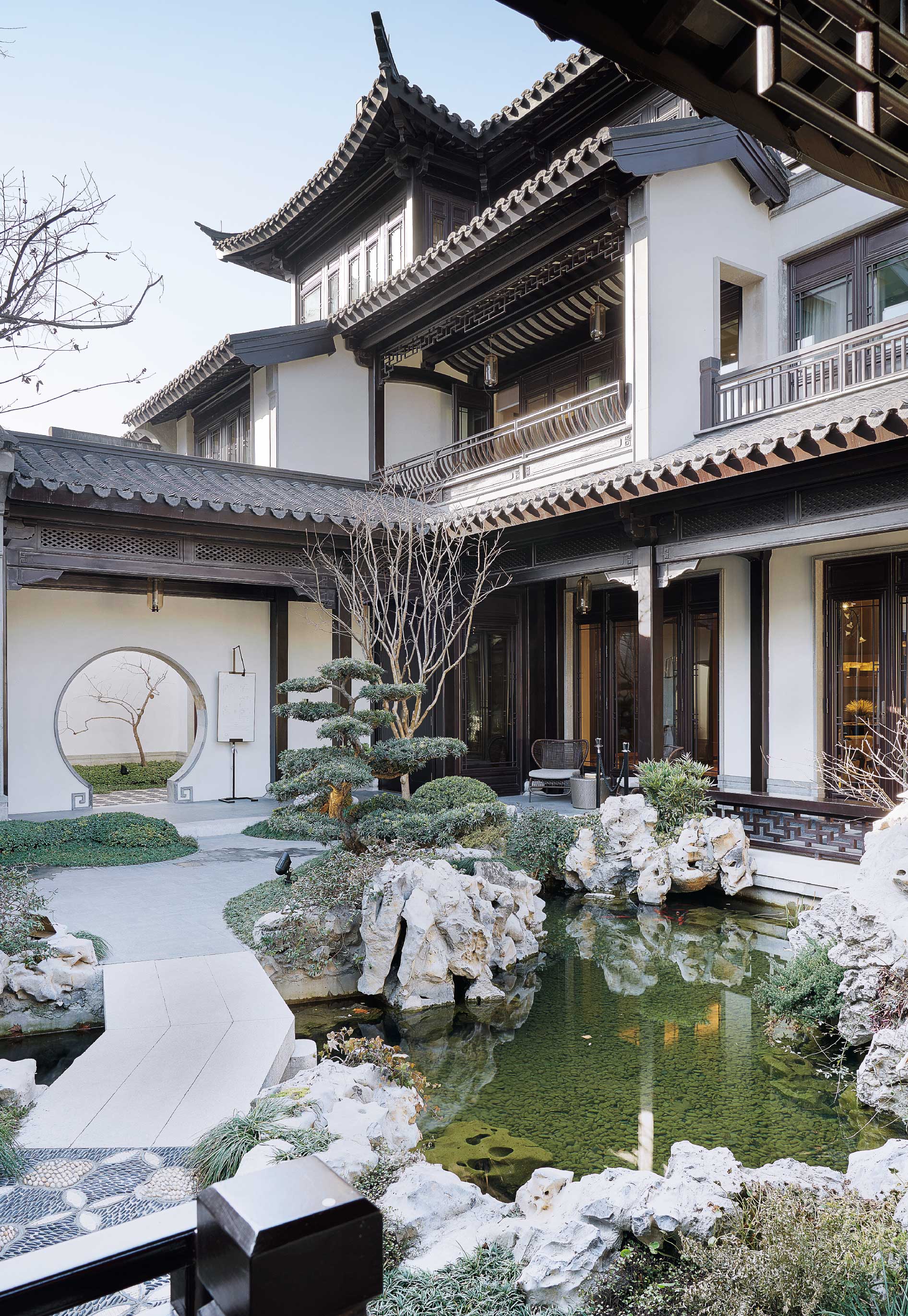 Hangzhou’s West Lake district, a UNESCO World Cultural Heritage Site, has inspired poets and artists for more than a thousand years with its blend of picturesque islands, flowering trees, and temple architecture. Matthew Carlisle, whose London-based firm designed the show villas and communal areas of Phoenix House, used the historic setting as an inspiration. The pond garden, with its artful boulders, penjing trees, stone bridges and circular »moon gate,« is an homage to Hangzhou’s time-honored style of lakeside landscaping. The fundamental principle: to arrange disparate elements in perfect balance to create an idealized scene. It’s a formula which could serve equally well as the motto of the Phoenix complex itself.