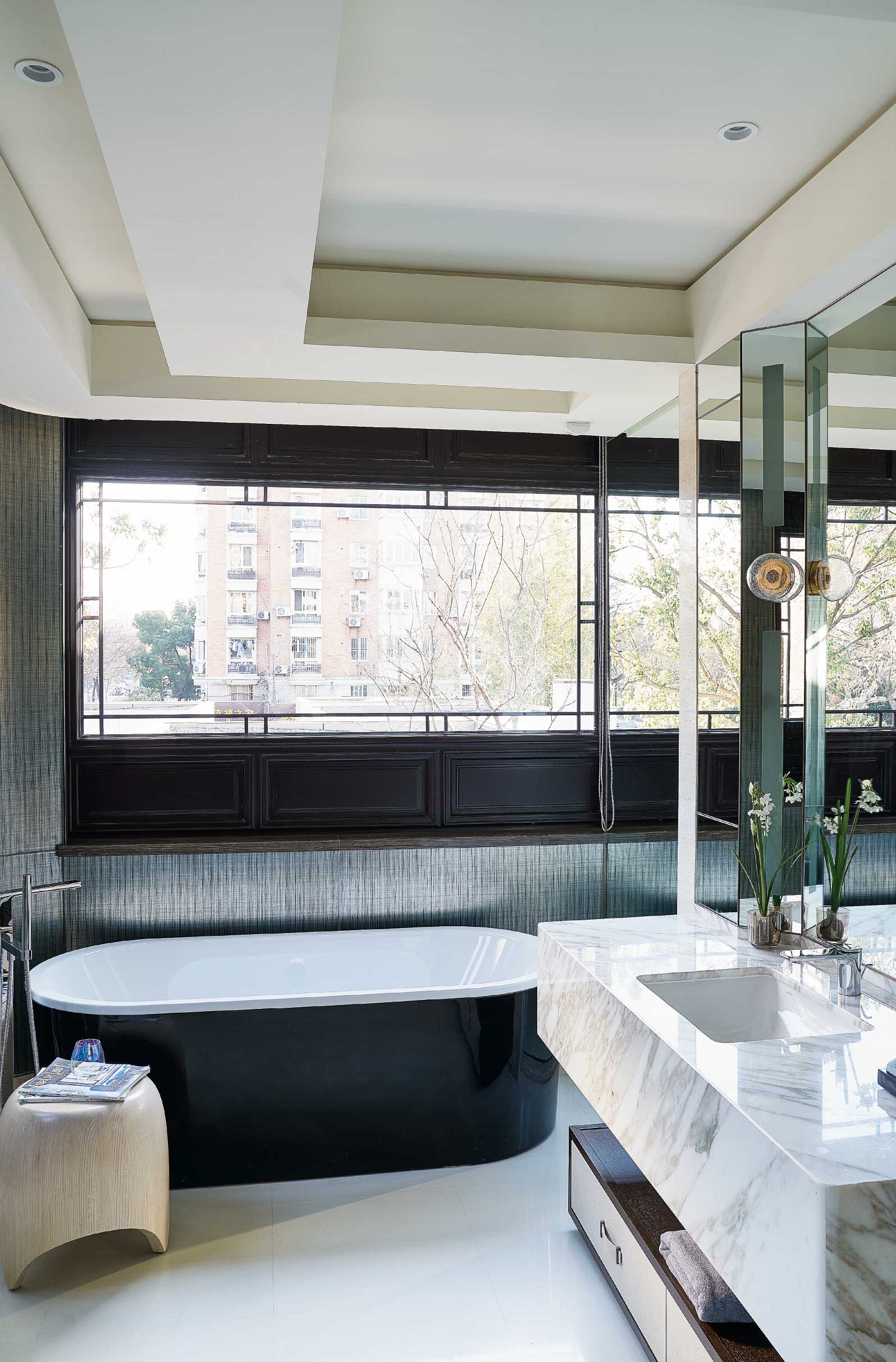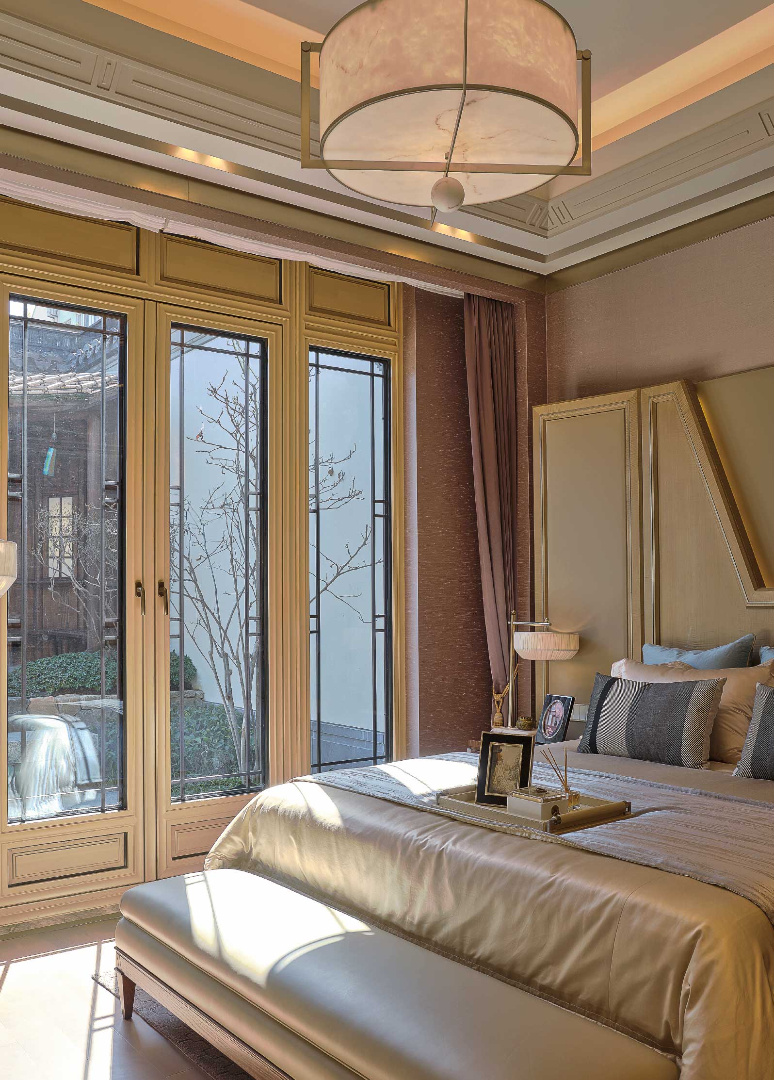 The furnishings and wallpapers use a contemporary European color palette with metallic finishes, like hand-carved trim painted in platinum leaf, for a distinctive Chinese flair. |