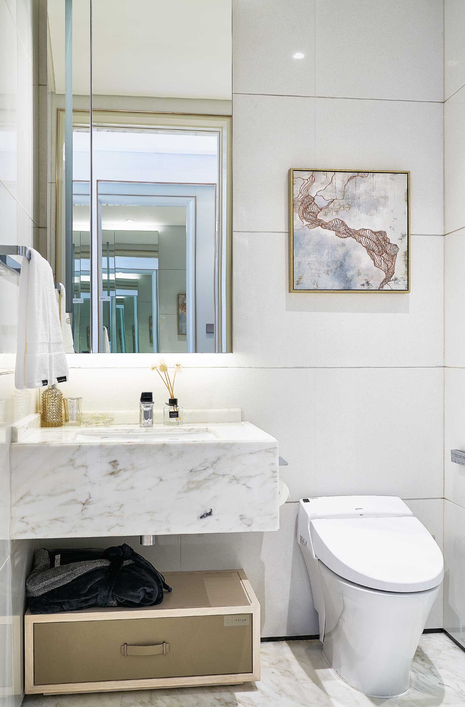 The interior décor also juxtaposes old and new. The furnishings and wallpapers use a contemporary European color palette – mostly soft, elegant whites and neutrals – but metallic finishes, like hand-carved trim painted in platinum leaf, add a distinctive Chinese flair. Highlights include rooms with traditional curved beams and extravagant chandeliers, as well as a beautiful abstract mobile that evokes a startled flock of birds. In the bathrooms, the INAX Satis shower toilet’s minimalist lines and luxurious array of features seem tailor-made to the opulent surroundings, equally well-matched to both the stylish geometric ceilings and the classic marble floors and counters.