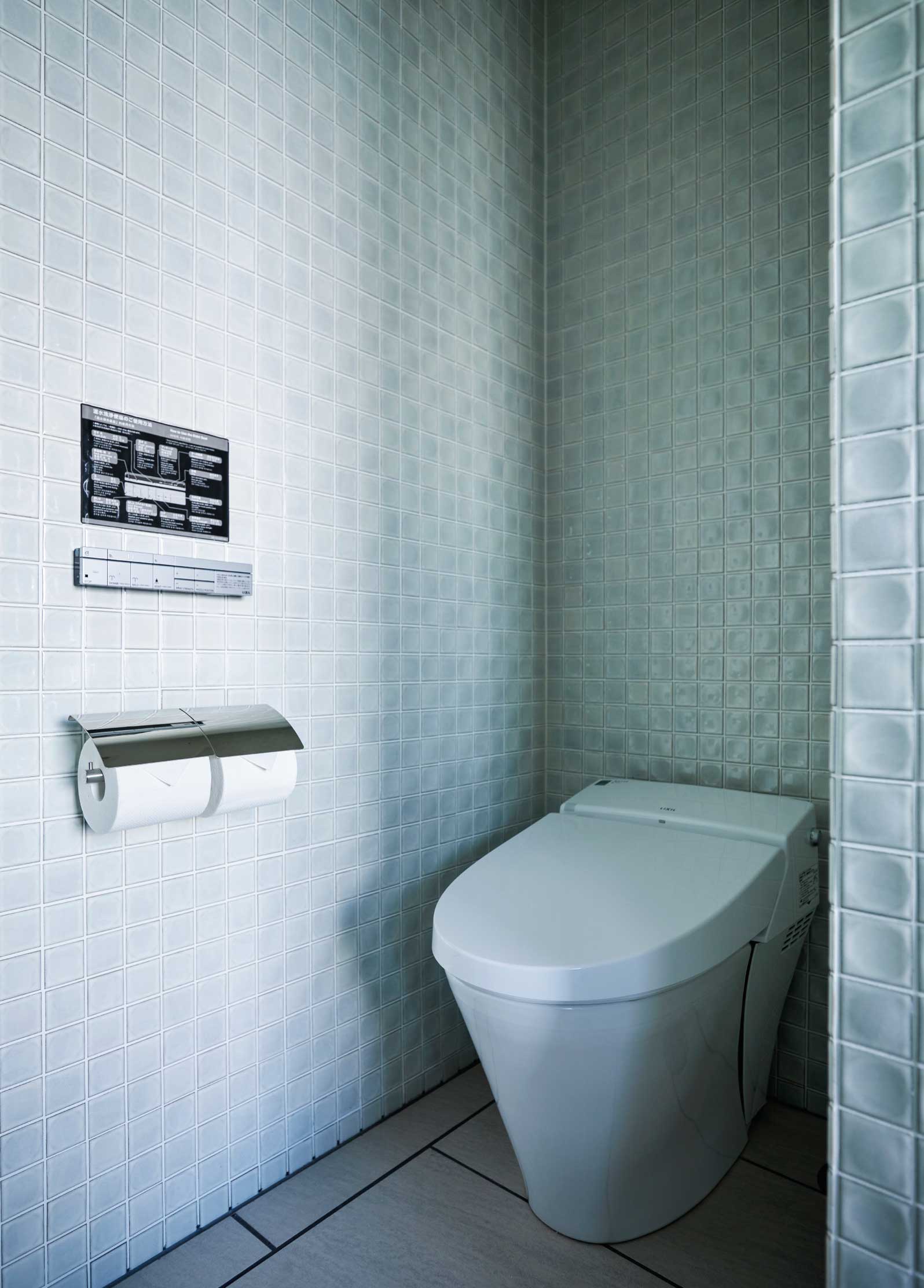 In the middle of one room sits LIXIL‹s five-star bath, FoamSpa. Neither air bubbles nor soap suds, but microscopically fine “velvet foam” with a consistency of whipped cream cradles the bather and seals the bather in hydration. Those who enjoy reading in the bath can rejoice, since the foam also cuts down on steam. In fact, with its soft, cushioned finish, FoamSpa tub is a boon to all who prefer to combine soaking with other relaxing activities. The suite also uses Ecocarat tiles, which excel at absorbing and controlling humidity, odor, and toxic substances, enabling