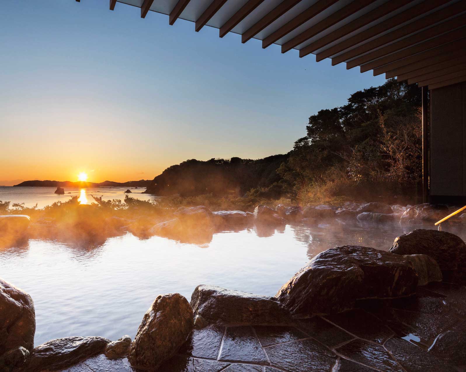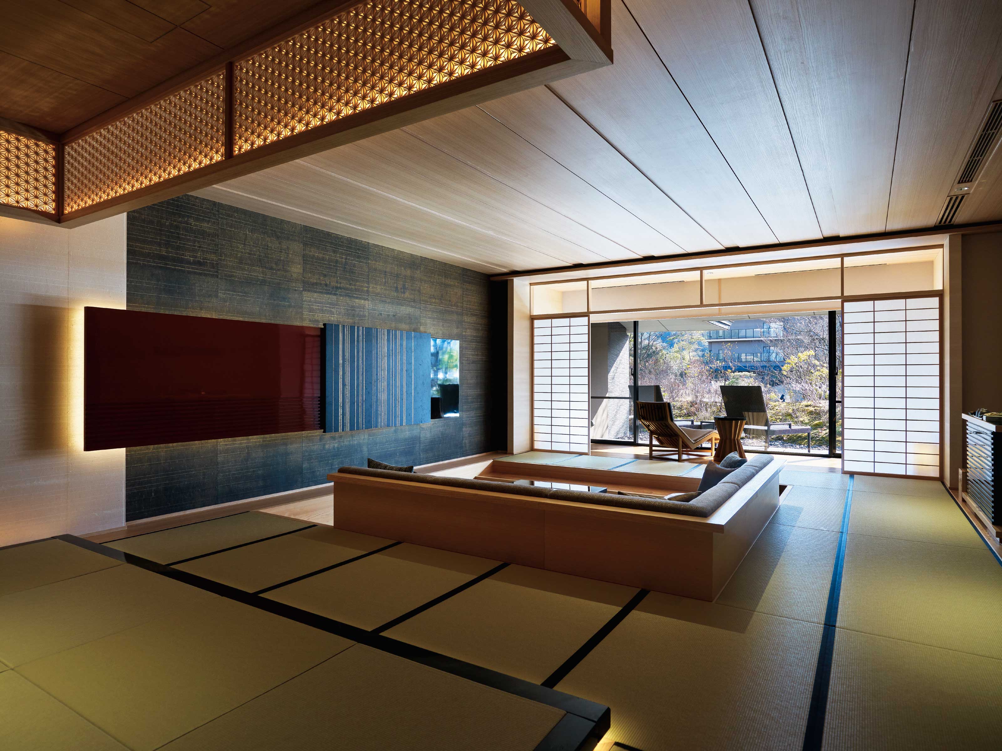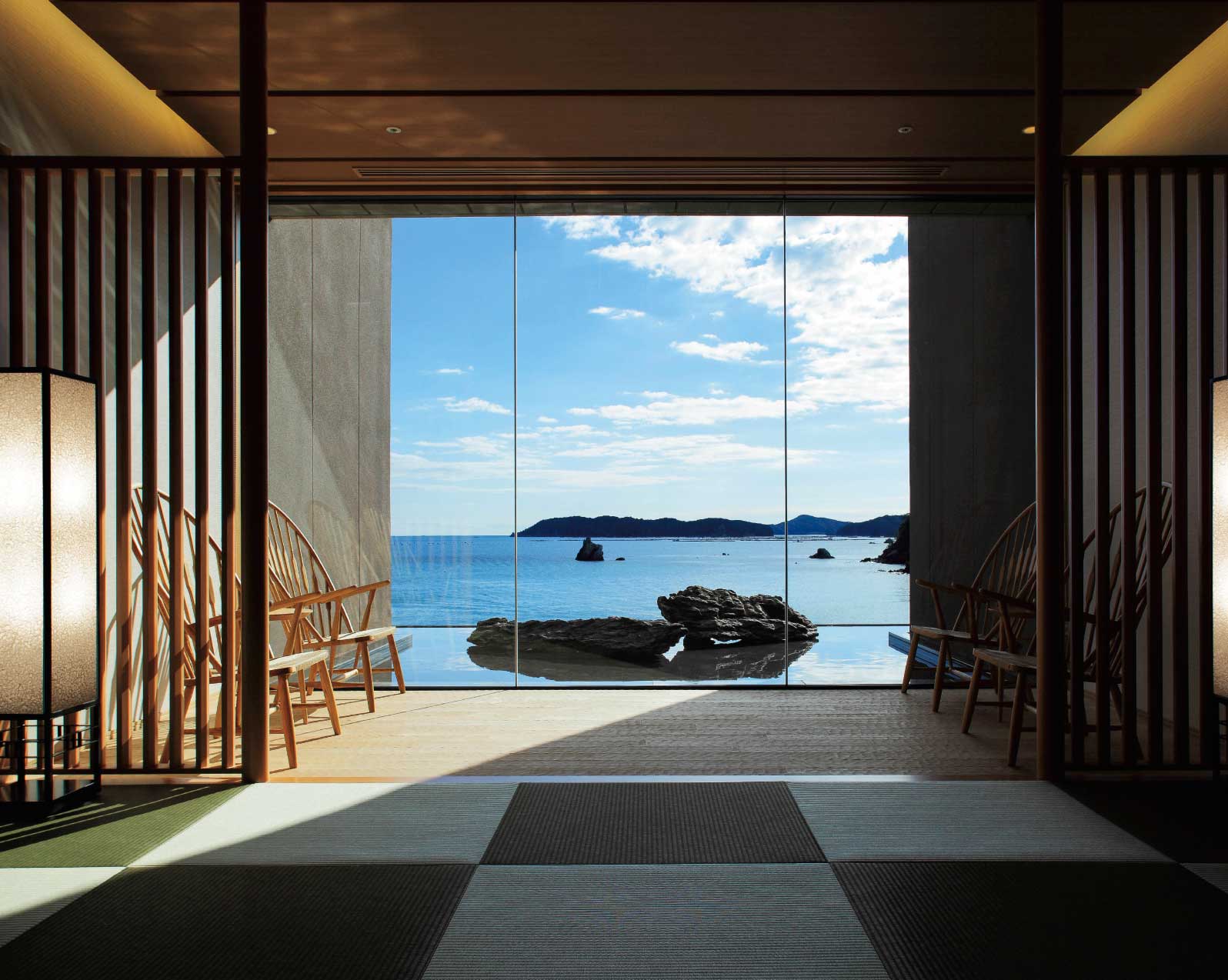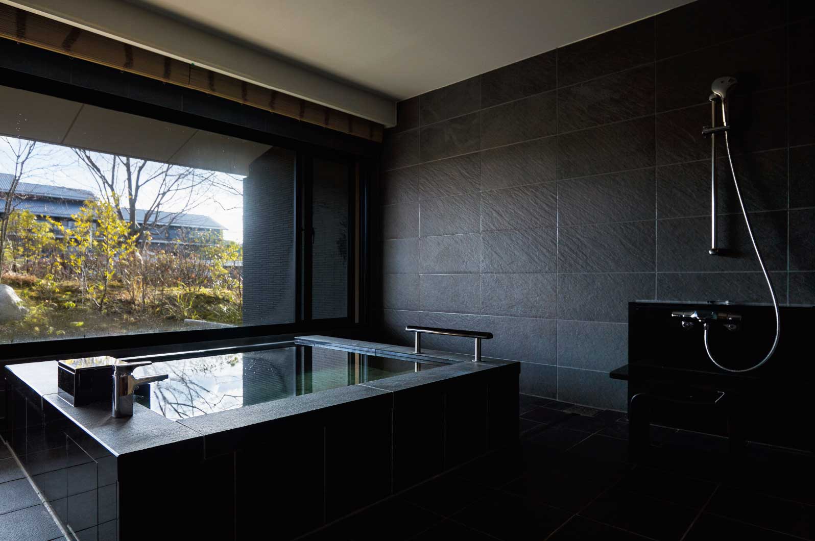 Yes, I used the same method. The bathwater actually comes directly from the hot spring, so you can enjoy the view outside and the hot spring inside at the same time. Also, everything from the ceilings to the height of the chairs is designed low. I structured the space low and flat, not as high as it would be in a western style.