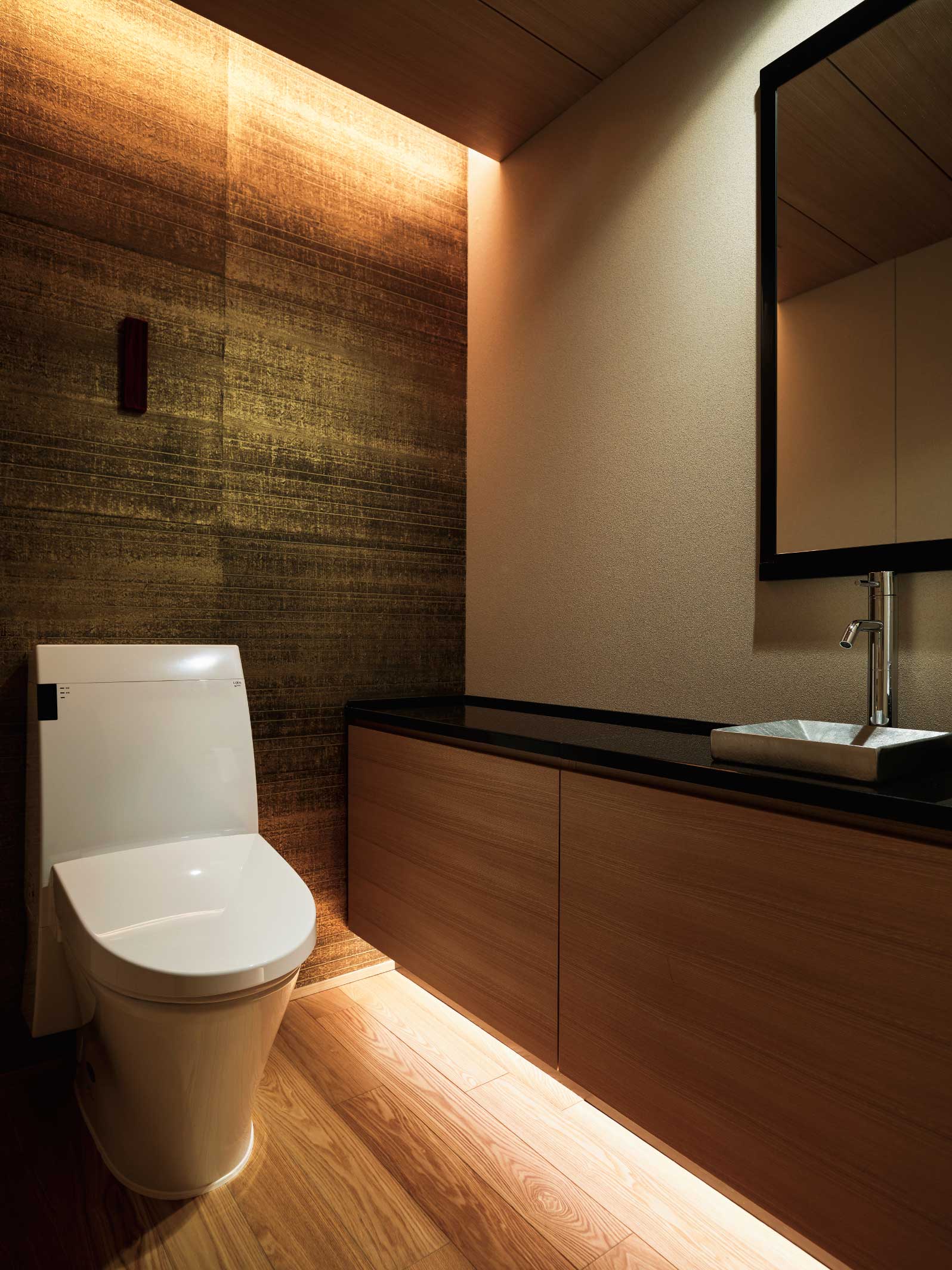 Suzuki’s vision for the resort goes well beyond historical recreation, of course. »We tried to capture the essence of Japanese traditional architecture, without building something completely traditional,« says the designer. To that end, the rooms also showcase dramatic rim lighting, sleek black ceramic surfaces, and wooden-slab sofas – all unmistakably modern. The bathroom fixtures, including INAX’s Asteo spalets, also add a dash of contemporary, plus state-of-the-art technology, to maximize comfort at this getaway dedicated to quiet relaxation.